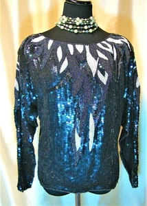 EUC Dominique S 100% Silk Fully Beaded Black Iridescent Occasion Vintage Blouse
