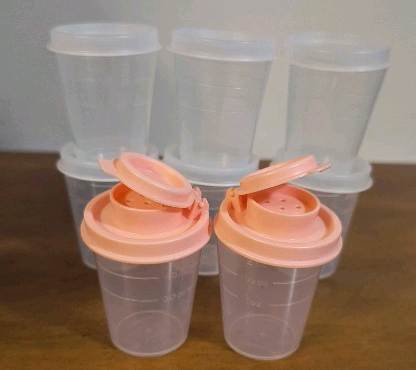 New Tupperware 6 mini tuppers Clear + 2 Salt/ Pepper Shakers Peach Color 2 Oz