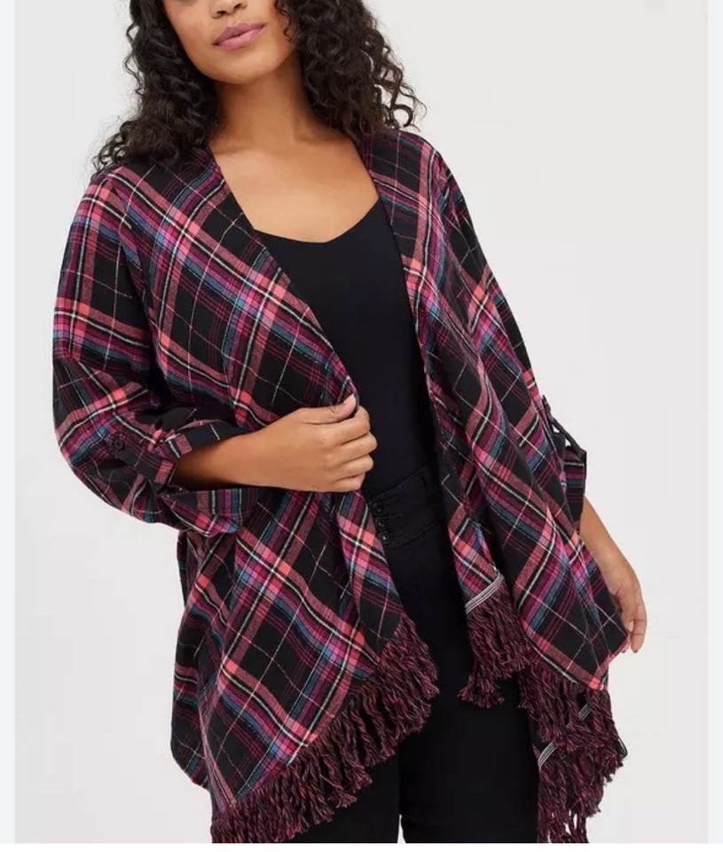 Torrid Flannel Draped Fringe Hem 3rd Piece Plaid Size 4 Roll Tab Sleeve Collared