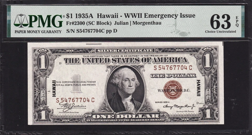 “USPC FR#2300 $1 1935A FRN HAWAII GRADED PMG 63 EPQ CHOICE UNCIRCULATED. ALL CORNERS ARE SQUARE AND ”... Read moreabout condition
