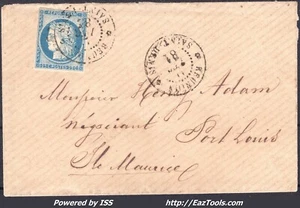 FRANCE CG N°23 SUR LETTRE POUR L'ILE MAURICE AVEC CAD ST DENIS REUNION DEC 1881