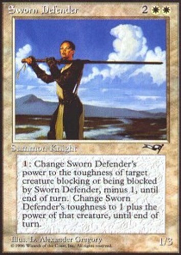 - 1 Sworn Defender's power becomes the toughness of target creature