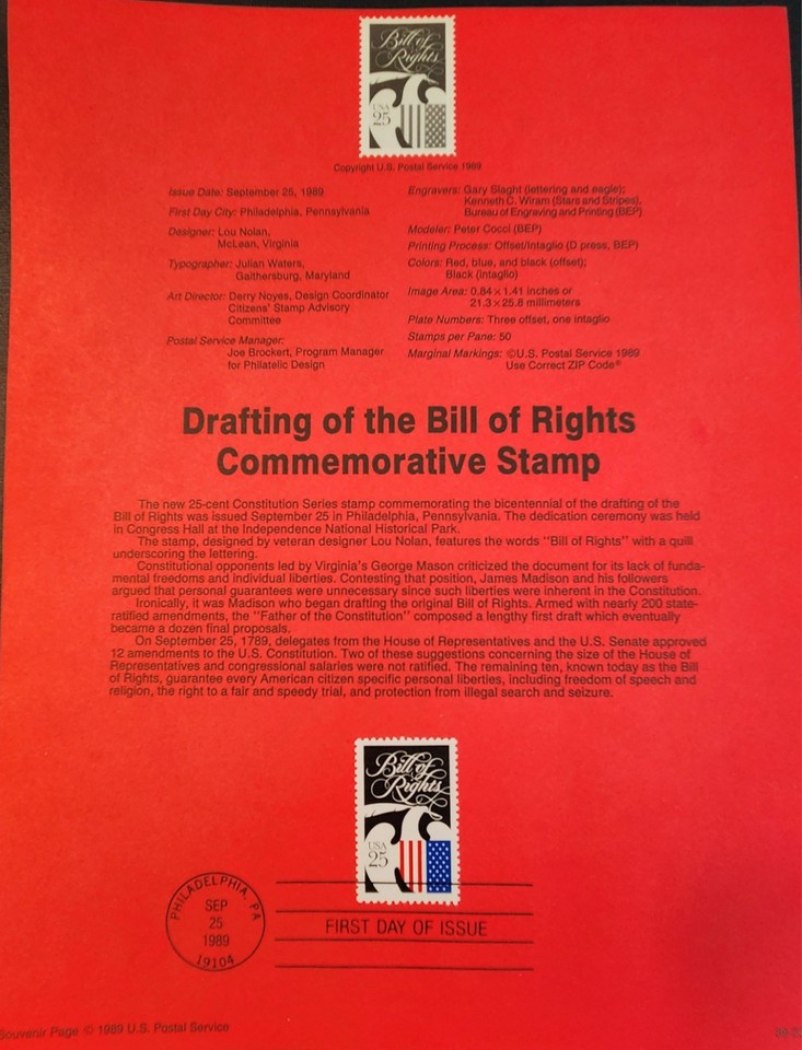 Scott 2421; 25¢; The Bill of Rights; FDC Stamp; Souvenir Page from USPS