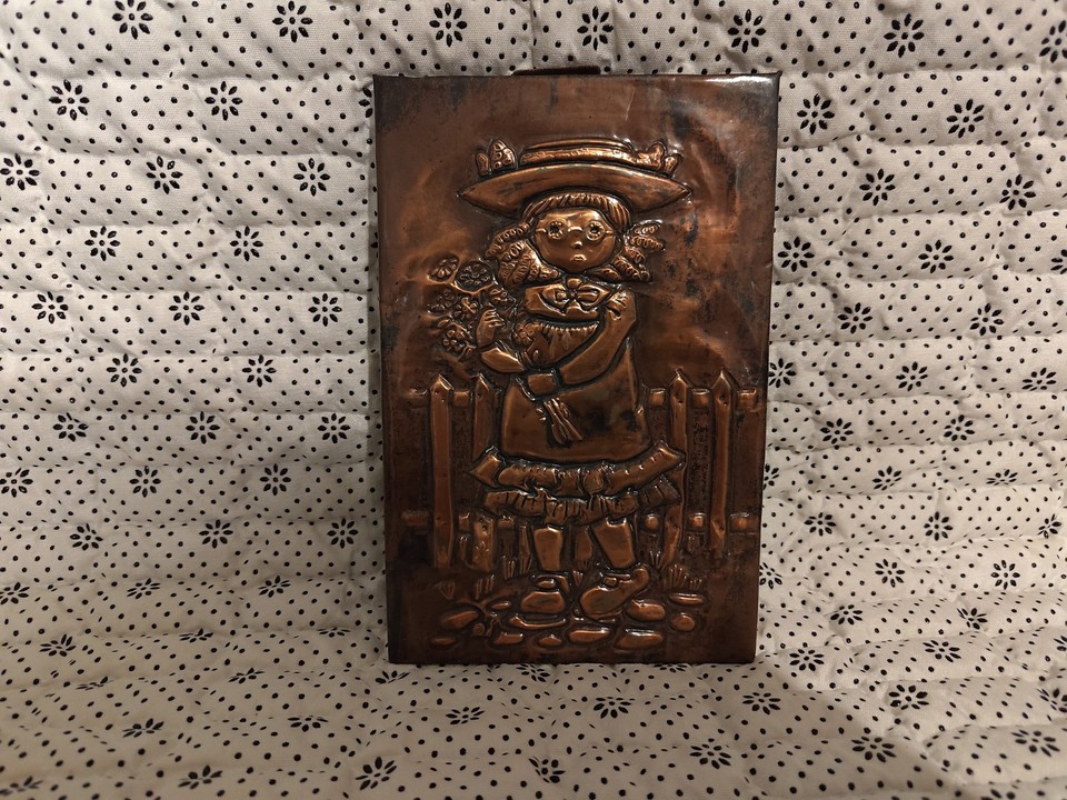 Vintage Folk Art Copper Artwork Hanging Plaque - Girl Holding Flowers