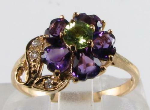 9K GOLD PERIDOT AMETHYST HEART DIAMOND CLUSTER DAISY SUFFRAGETTE RING SIZE O