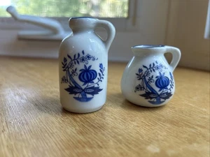 2 Reutter Porcelain Blue Onion Miniature Jugs Vases Gray Blue Germany Vintage