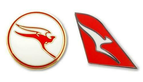 SET OF 2 QANTAS AUSTRALIA TAIL FIN LOGO & RETRO ROUND PIN BADGE AVIATION AIRLINE