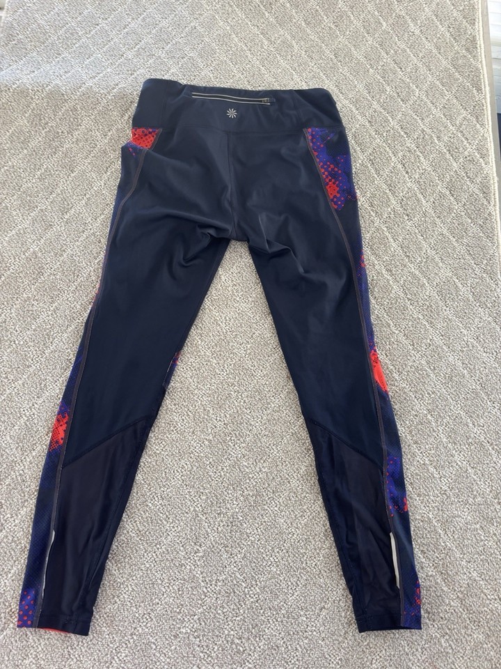 ATHLETA Back Stash Pocket Tights Low Rise Small Black w/ Red and Purple Design