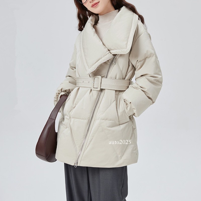 White Duck Down Lapel Collar Jacket Womens Slim Down Belted Retro Warm Jackets