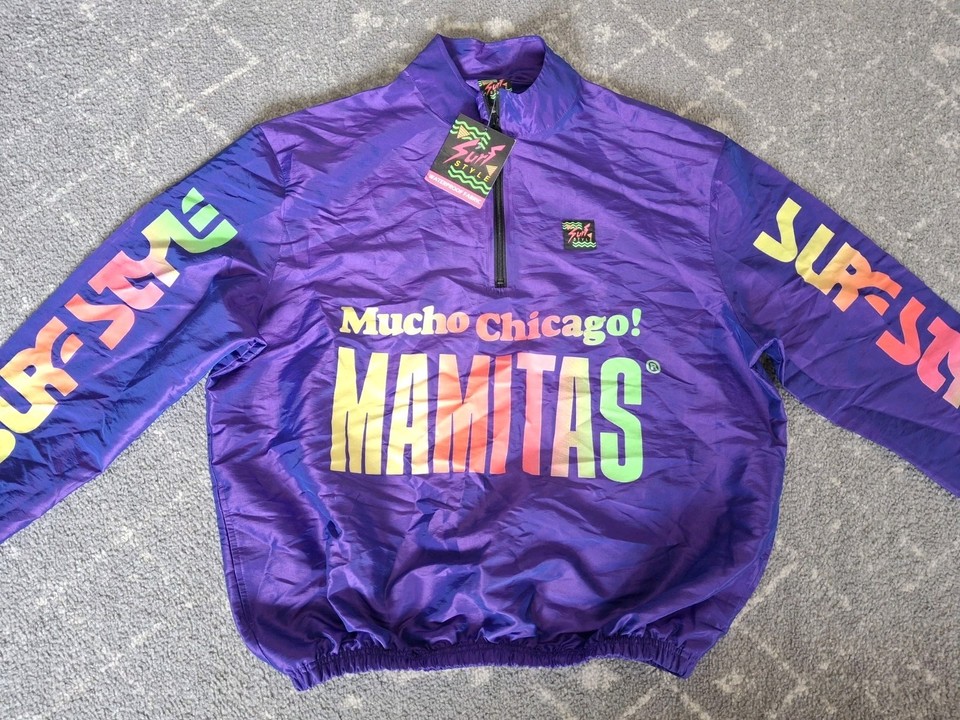 Vintage Surf Style Windbreaker Jacket Purple Mucho Chicago Mamitas 1/4 Zip L NWT