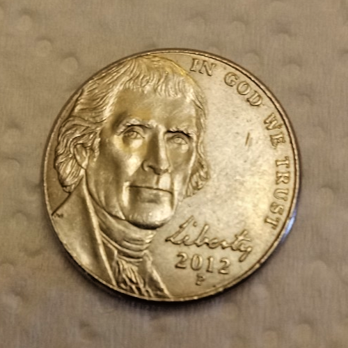 Jefferson Nickel 2012 P Error Number 4 on the obverse next to we in God we trust
