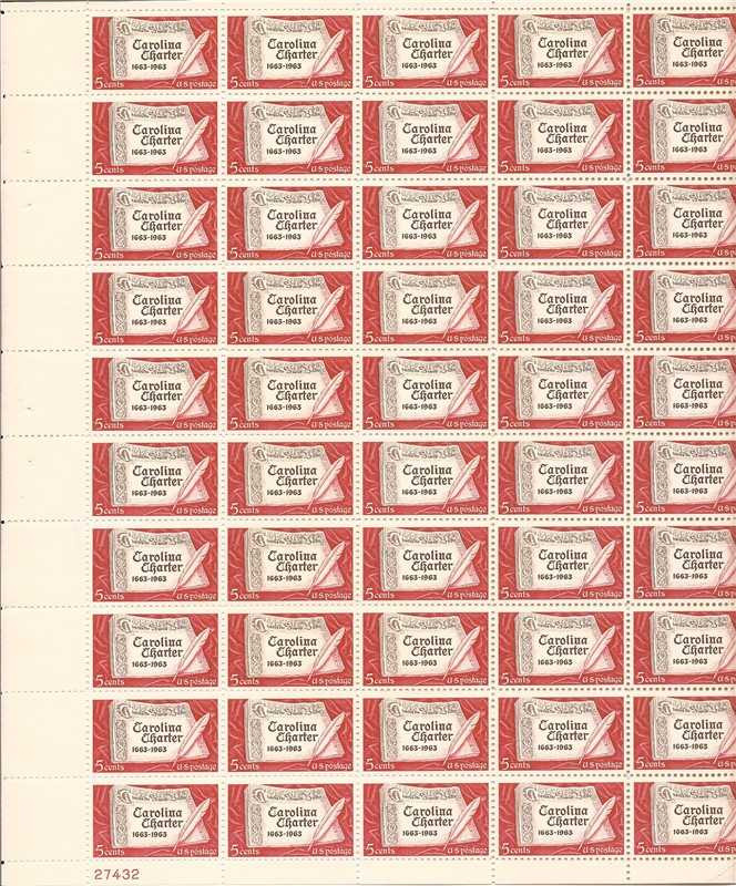 US Stamp - 1963 Carolina Charter - 50 Stamp Sheet - Scott #1230