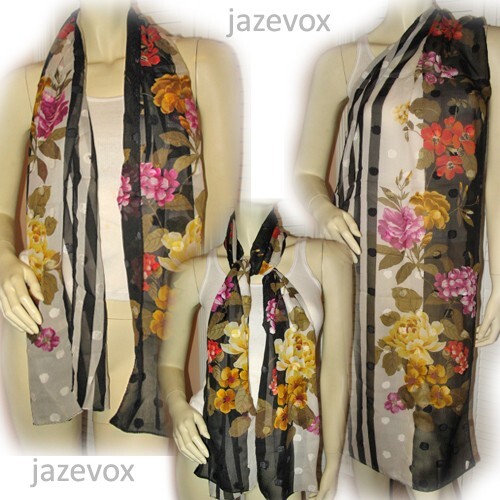 Vintage Y2K 90s Scarf Scarves Wrap 64inX16.5in Floral Print Striped Black White