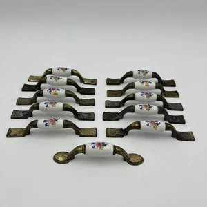 Set Of 11 Vintage Porcelain Flower Floral Gold Tone drawer pulls 5” READ