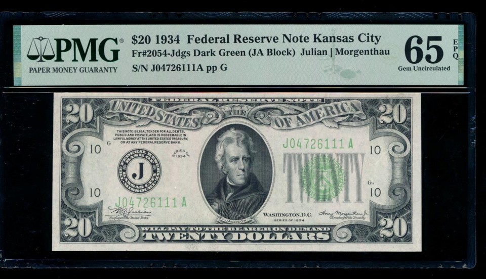 AC Fr 2054-J 1934 $20 Kansas City PMG 65 EPQ uncirculated