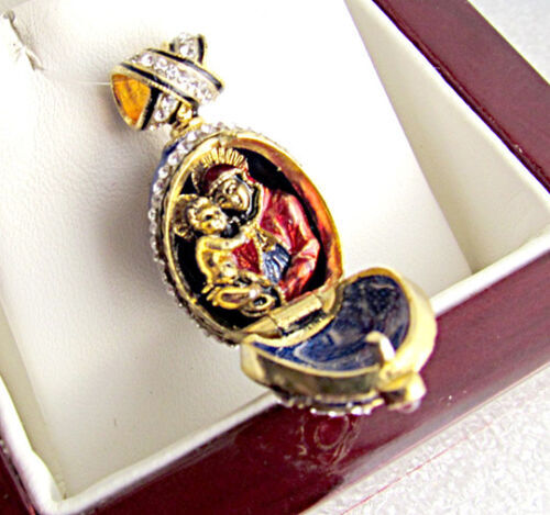 LOCKET EGG PENDANT ENAMLED SOLID STERLING SILVER 925 & 24K GOLD MOTHER OF GOD