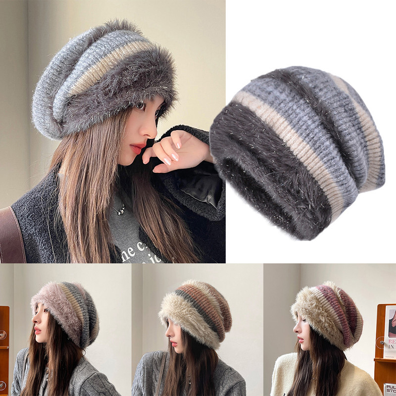 Men Women Beanie Hat Cap Striped Knit Skull Cuffed Winter Warm Slouchy Plush Cap