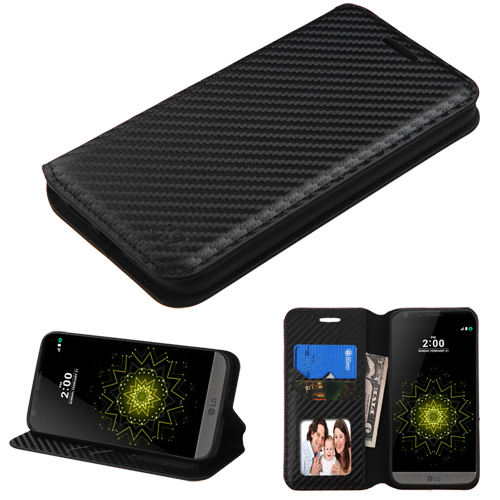 Black Carbon Fiber Print Folio Flip Case w/Stand Faux Leather Cover for LG G5