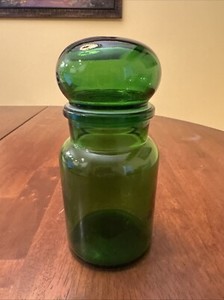 Vintage Green Glass Apothecary Bubble Lid Bottle Container Jar Belgium 7”
