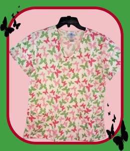 NWT SB SCRUB TOP Large White w 2 Tone Pink Green Flying Butterflys 2 Pockets