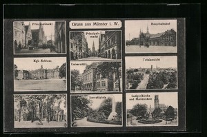Münster i. W., Ansichtskarte, Prinzipalmarkt, Hauptbahnhof, Universität