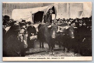 Ezra Meeker Arrival Indianapolis Indiana January 1907 Postcard Oxen Wagon
