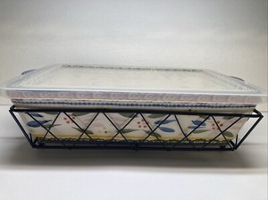 Temp-tations 4pc Old World Blue 11x7 2.5 qt Dish, Stand, Glass Trivet & Plas Lid