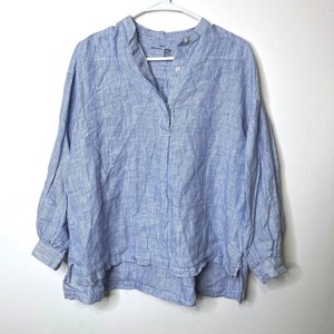 100% Linen Blouse Top XS/S Blue Striped Oversized Long Sleeve Coastal