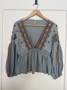Free People Aria Top Sz S Blue V Neck Embroidered Gathered Long Sleeve Boho