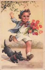 CP ILLUSTREE ENFANT BERET COURT AVEC FLEURS CHIEN - 99879