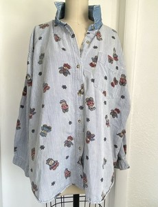 90s Vintage Top Womens Blue Striped Teddy Bear Print Button Shirt Denim READ