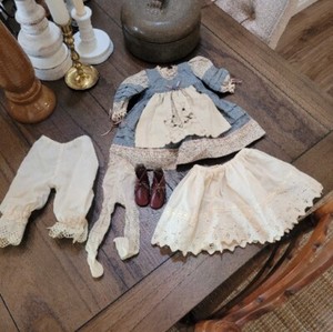 Doll Outfit Dress With Attached Apron Pantaloons Socks Boots Blue Pink Beige