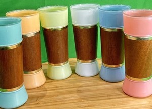 Vtg MCM Mahogany Wood Wrap Siesta Ware Hawaiian Tiki Bar Frosted Glass Set 6