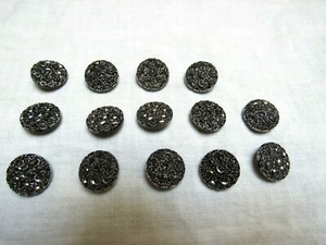 Vintage Set 14 Le Chic Buttons Black Glass Silver Luster Faceted Scrolls