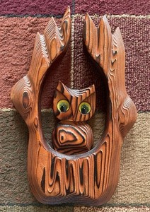 Vintage MCM Carved Burnt Wood Owl Wall Plaque 11.5 x 7.5 Cryptomeria Tree Hallow
