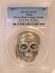 2017 Palau $5 Pirate Skull Antique Finish PCGS MS70 First Day Of Issue