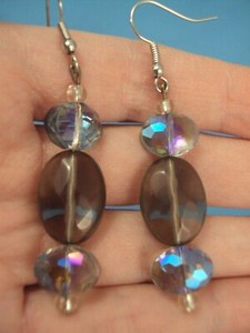 gray Smoky Quartz crystal gemstone + faceted light blue silver dangle earrings