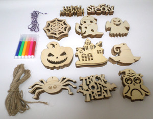 Shindel Halloween Wood Ornaments 66 Pieces Unfinished Wood Cutouts and Cord