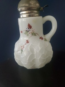 VICTORIAN EMBOSSED Melon Shape OPAQUE GLASS SYRUP JAR METAL HINGED LID SPOUT 6"