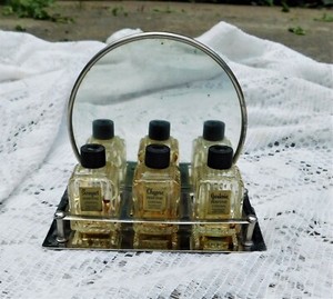 VINTAGE 1940's / 50's CHROME ART DECO CARDINAL COLOGNE STAND W/ BOTTLES & MIRROR