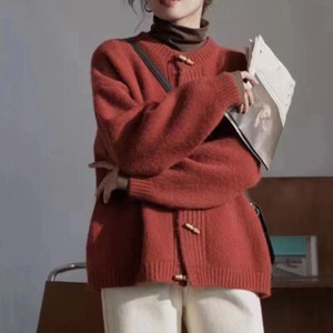 Lady Horn Button Knit Cardigan Jacket Round Neck Tops Loose Sweater Casual Solid
