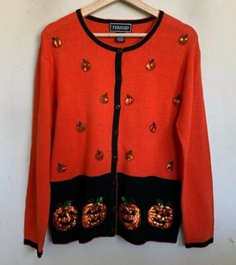 Terazzo Womens Halloween Cardigan Orange Black Sequin Pumpkins Buttons Size M