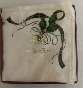 Lenox set of 6 Fabric Cocktail Napkins- Ivory with Holly design