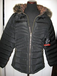 Nordic,Reversible Puffer Jacket,Black/Leopard Fur Hood Coat,Zippers,L