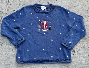 Christopher Banks Hand Embroidered Christmas Holiday Knit Sweater Blue Santa VTG