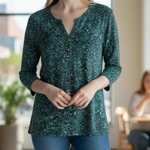 Karen Scott Womens 1X Tunic Top Floral Print 3/4 Sleeve V Neck Henley Green