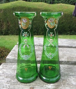 Pair Bohemian Emerald Green Glass Vases, Hand Enamelled Forget Me Not & Bows