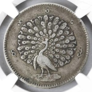Burma PEACOCK 1852 Kyat Silver Coin CS1214 Myanmar Asian Mandalay Mint, NGC VF35