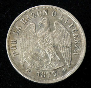 1877 So UN PESO - REPUBLICA DE CHILE - POR LA RAZON O LA FUERZA - HIGH GRADE