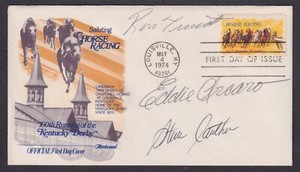 Ron Turcotte, Eddie Arcaro, Steve Cauthen, Jockeys, signed horse racing FDC